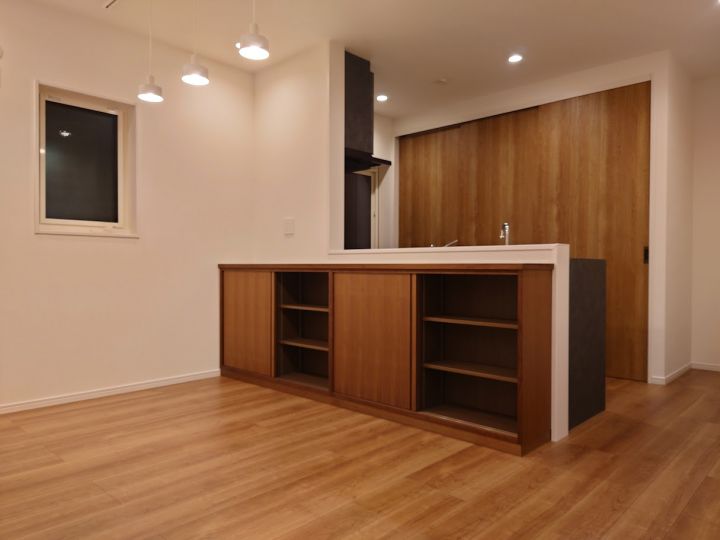 奥様こだわりのフロントオープン食洗機をビルドインしたキッチン、洗面化粧台、ガス衣類乾燥機を備え、家族全員でくつろげる大空間リビングに仕上ました。