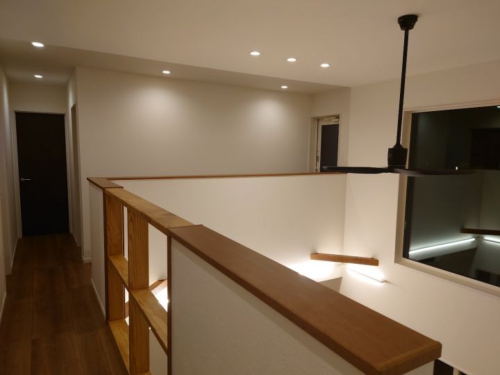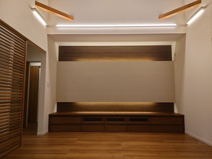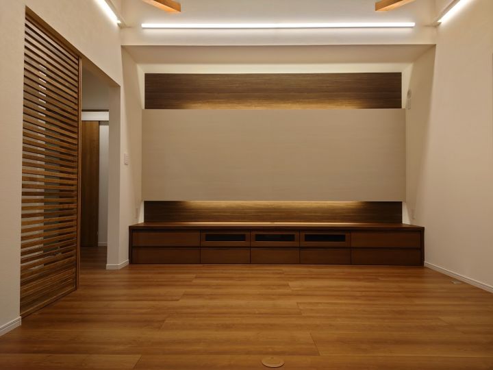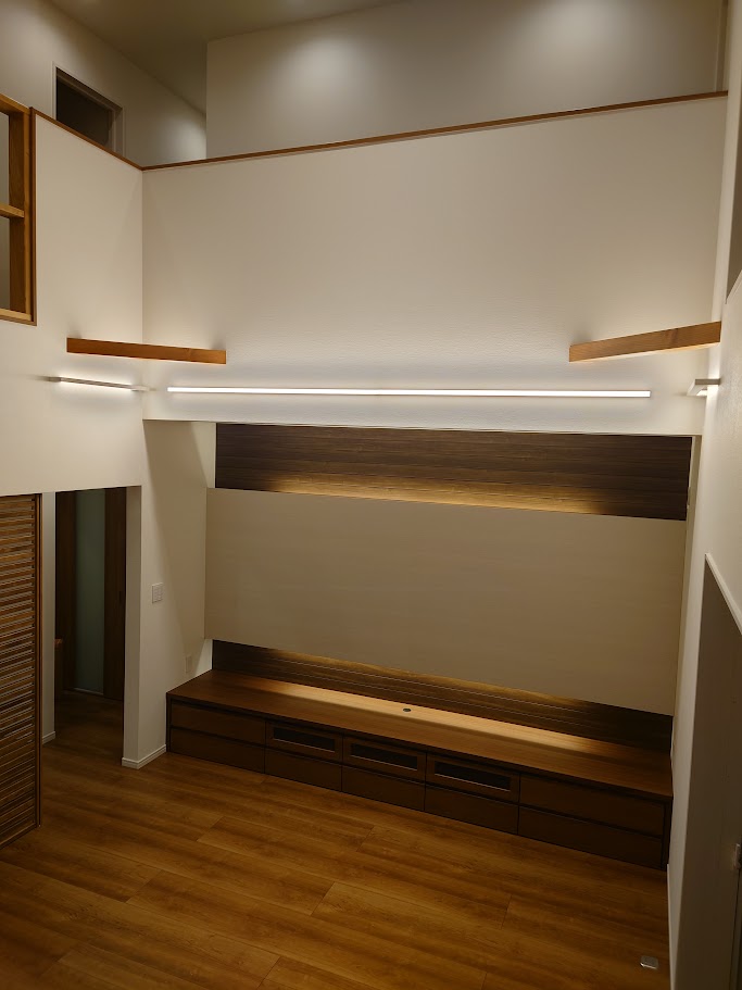 リビングの間接照明や奥様こだわりのキッチン、随所にオリジナル造作家具を配置した住宅です。