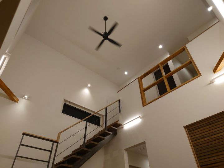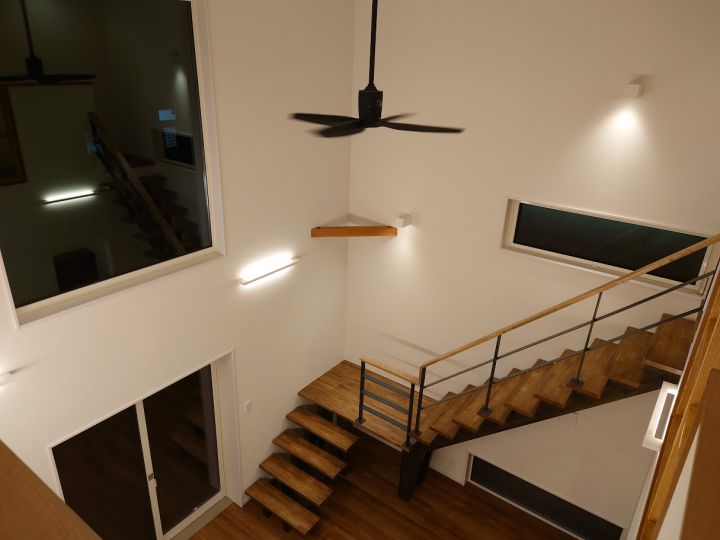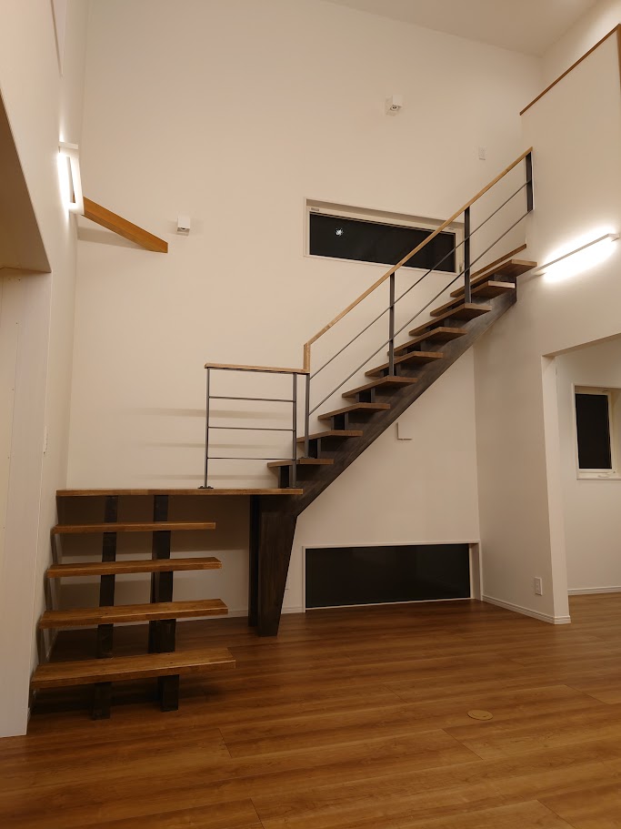 住宅部分は大解放な吹抜のあるリビングに踊り場にも座れるストリップ階段を設置しています。